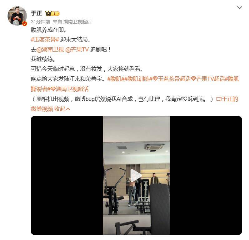 事情起因很简单,于正当天在微博晒出原相机直出的健身视频,高调宣布“腹肌养成在即”,并为自己担任制片的新剧《玉茗茶骨》大结局宣传造势。视频里,他的腹部线条清晰,已然呈现出4块腹肌的轮廓。没想到,这“阶段性成果”太过亮眼,竟被平台算法误判为非真人内容,直接贴上了AI生成的标识。