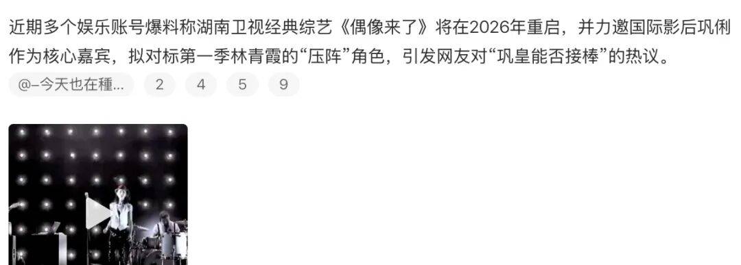 作为重启综艺数量最多的行业先锋,芒果系今年似乎加快了重启更多节目的脚步。《我们来了》(前身《偶像来了》)被传拟邀国际影后巩俐,昭示了芒果重启该IP的底层逻辑,那就是当年为林青霞、赵丽颖、欧阳娜娜等不同代际内娱女星打造群像的“女神之战”模式放在今天依然很有爆点,节目有望与《浪姐》组成芒式她综艺双子星。