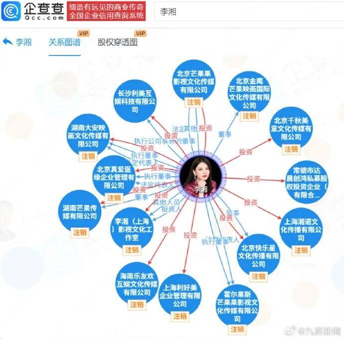 据企查查信息显示,李湘名下超10家公司已为注销状态,包括李湘(上海)影视文化工作室、湖南芒果传媒有限公司等,行业涉及租赁和商务服务业、文化、体育和娱乐业,李湘多担任股东、执行董事、总经理等身份。