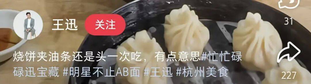 近日,男演员王迅在个人社交平台晒出在杭州街边小店吃早饭的视频,并配文称:“烧饼夹油条试试头一次吃,有点意思。”