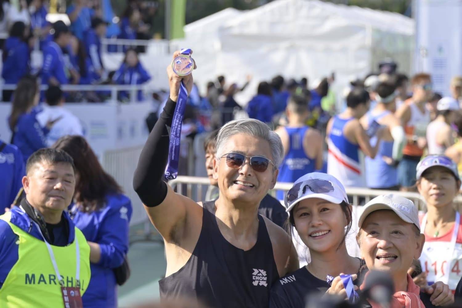 周润发透露这次选择10公里,是要陪伴刘江老师迈入80岁。他的身边还有76岁的鲍起静、74岁的郑则仕。四人完赛后对着镜头表示他们是几百岁的组合。提到全马赛事时,周润发笑言:“再等20年吧。”