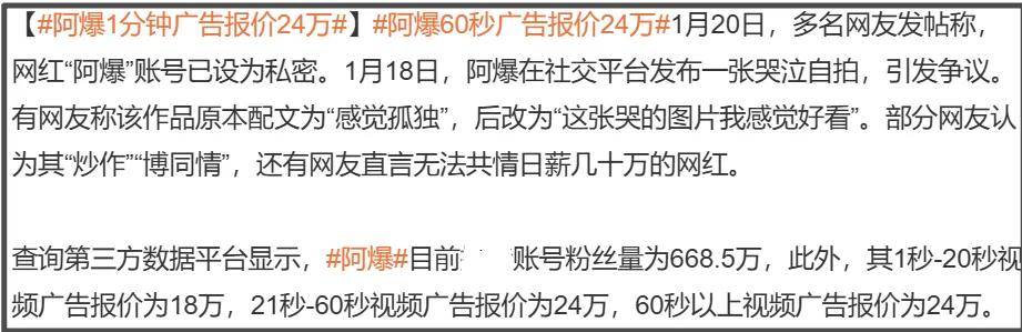 这位卖惨翻车的网红名为阿爆,是一位搞笑博主,一个短视频账号就有600多万粉丝,媒体查询到阿爆商务报价,1秒-20秒视频广告报价为18万,21秒-60秒视频广告报价为24万。