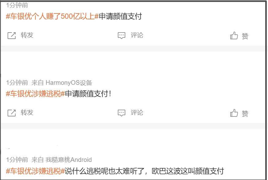 一路围观下来,车银优的辩解就显得很无力了,他声称因为经纪公司频繁更换高层,他和母亲出于对未来的担忧才成立了公司,公司存在实际业务,并非空壳,半点没提自己为什么不交个人所得税。