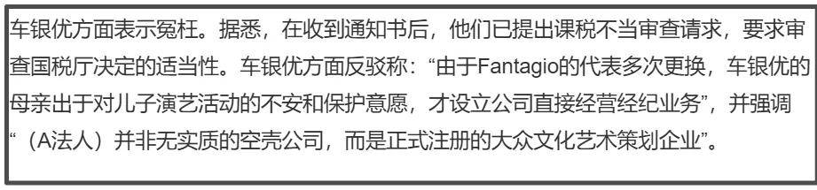 也就是说,车银优及其母亲为了不交45%个人所得税,就用空壳公司处理收入,就只需要交25%的法人税了,是娱乐圈明星常用逃税手段——同样的手段,内娱女星袁冰妍也用过。