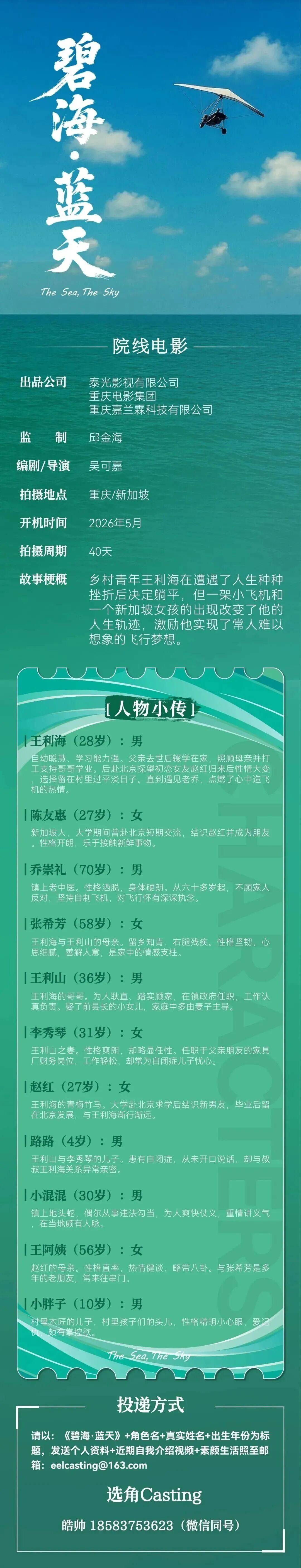 请以:《碧海·蓝天》+角色名+真实姓名+出生年份为标题,发送个人资料+近期自我介绍视频+素颜生活照至邮箱。