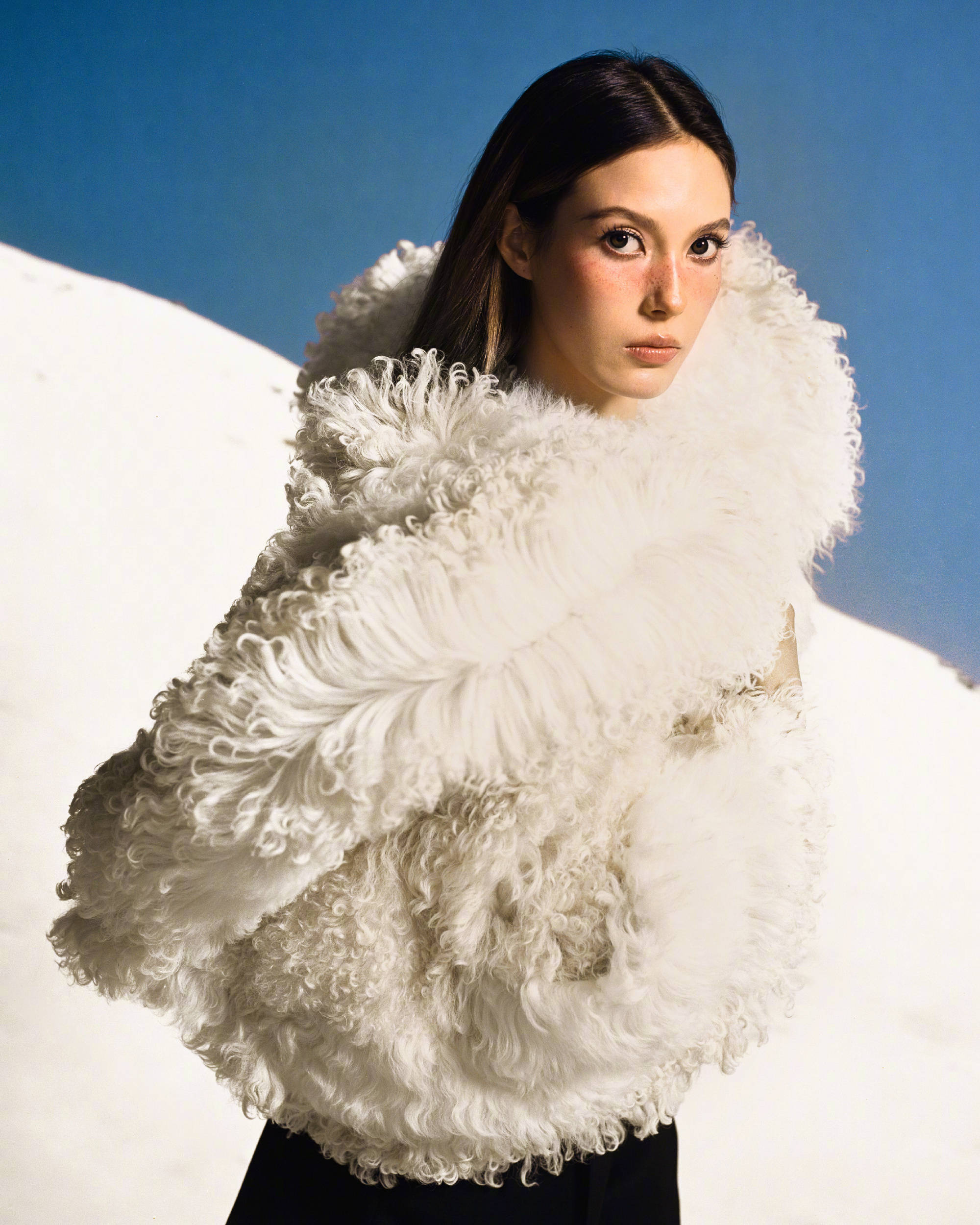 谷爱凌白绒披肩侧身而立,神态坚定。