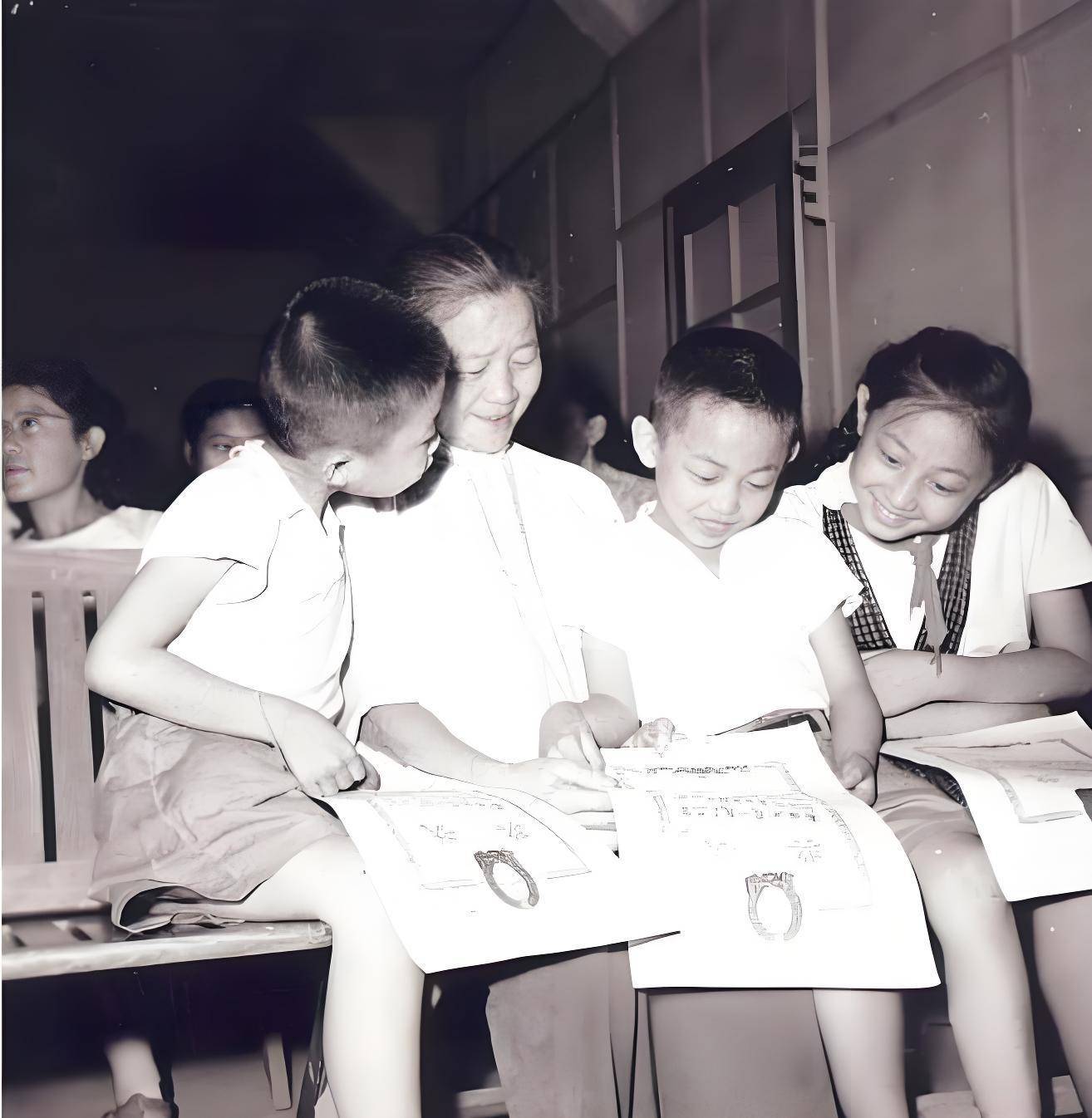 1962年,8岁的聂继波(右二)与10岁的哥哥聂卫平(左一)和姐姐聂珊珊(右一)高兴地与姥姥一起观看奖状。