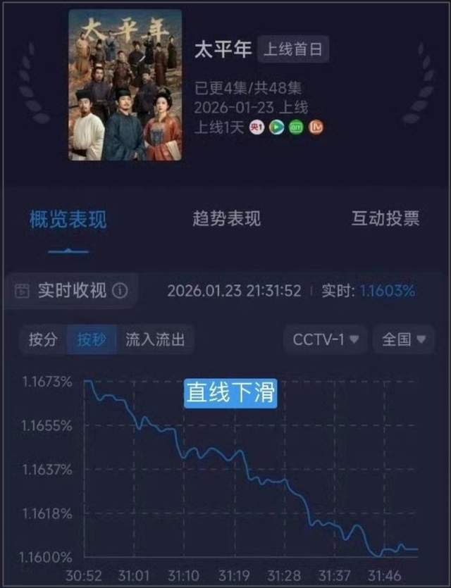 《太平年》开播之前就被多个平台买股,该剧不仅在央视一台上星播出,还分别在鹅厂、桃厂和芒果三个网播平台上线。遗憾的是,开播当日,各个播放渠道收获的成绩都十分惨淡。