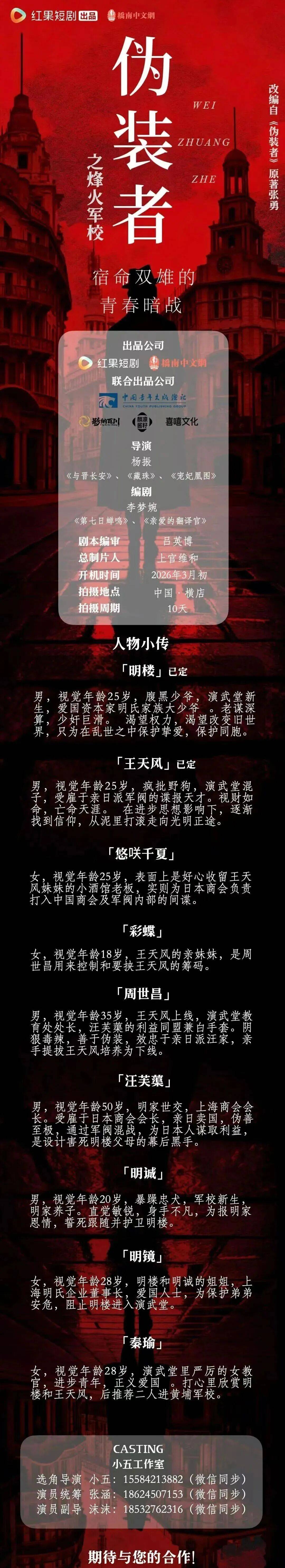 免责声明:戏客Seeker公众号(“本平台”)中全网组讯的信息、内容(“组讯信息”,包括但不限于影视项目名称、项目介绍信息、出品公司信息、导演信息、选角团队信息、拍摄相关信息、联系方式等)均来源于内容信息相关方提供或互联网公开信息。本平台不对组讯信息的真实性、准确性、完整性、及时性、关联性、适用性及安全性提供任何明示或默示的担保。请您谨慎参考或使用组讯信息,并确保您的人身、财产安全,本平台不对您使用或参考组讯信息而造成的后果承担任何责任。