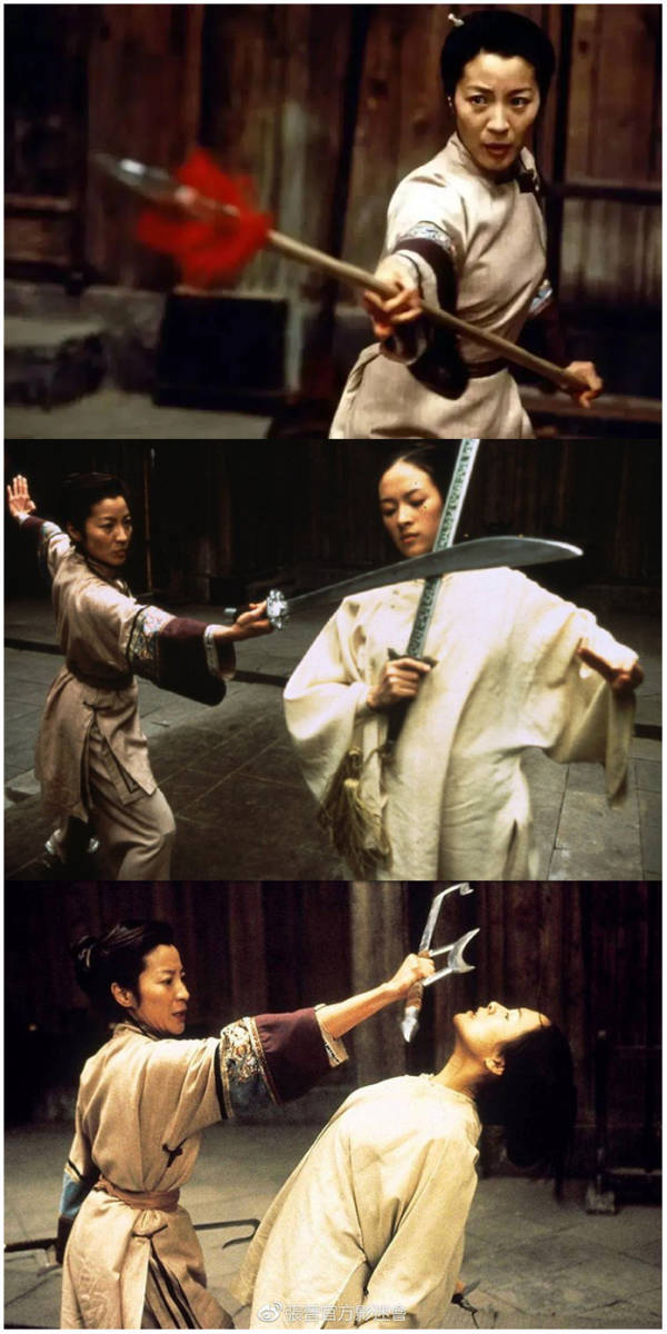 和我们熟悉的另外两派香港武侠功夫电影不同,袁和平的动作风格属于“硬桥硬马”,非常强调功夫和兵器的“技术性”。无论是《黑客帝国》《卧虎藏龙》还是《黄飞鸿》,华丽的招式都能被拆解成非常基础,有章可循的传统武术套路基本功,观众往往会有种“这是在借电影镜头进行中国传统武术科普教学”的感觉——最典型的例子莫过于《卧虎藏龙》里那段杨紫琼和章子怡电光火石般的十八般兵器使用方法展示。