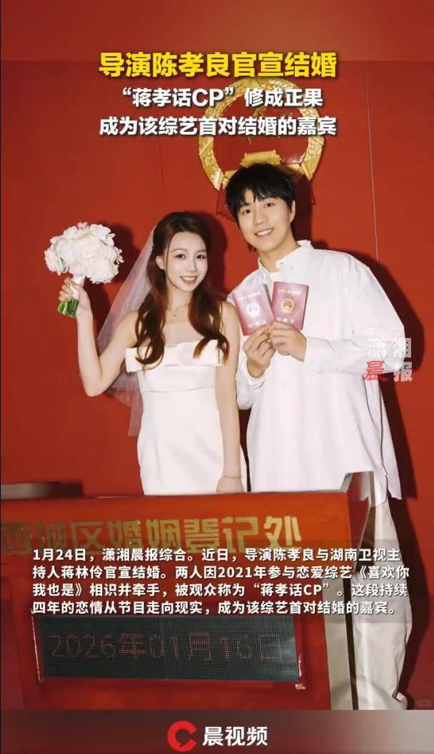 这对新人选择在2026年1月24日通过社交平台公开了他们的婚讯,附上了他们的结婚证和登记现场的照片,并配文从喜欢你到一辈子喜欢你,甜蜜的文字仿佛能从屏幕中溢出。回望他们的相识历程,这段缘分的起点要追溯到2021年的恋爱综艺《喜欢你我也是》第三季。节目中,陈孝良是一位来自内蒙古的导演,蒋林伶则是湖南卫视的甜美主持人。两人在节目中通过十分默契的互动,迅速吸引了观众的目光,并被大家亲切地称为蒋孝话CP,他们的化学反应似乎在每一秒钟都充满着甜蜜与火花。最终,这段节目中的浪漫延续到了现实,两人成功牵手,成为了荧幕情侣。而从节目中的情侣走到现实中的夫妻,他们花费了整整四年。如今,他们终于走到了一起,成为了《喜欢你我也是》这档热门恋综开播以来,第一对正式步入婚姻殿堂的嘉宾。这个突破性的第一无疑给那些追看过节目的嗑学家们注入了一剂强心针,证明了原来综艺中的甜蜜,真的可以酿成现实中的幸福。
