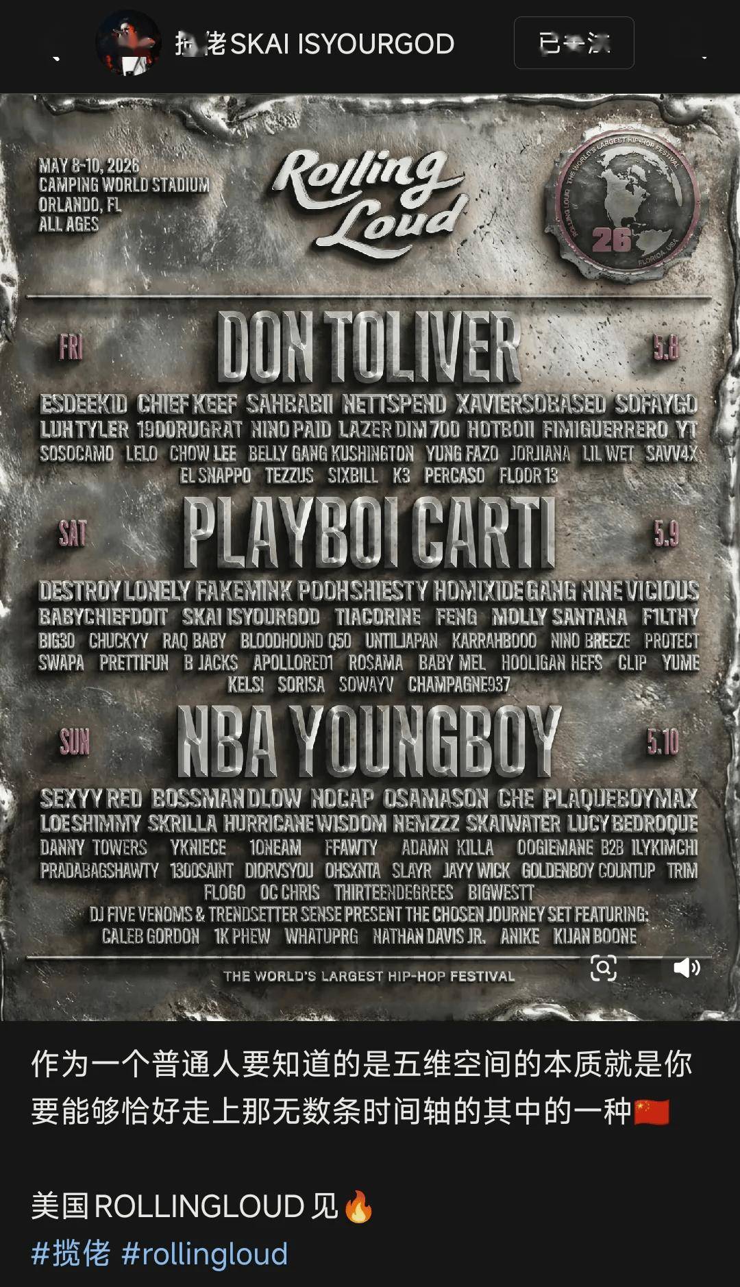 1.登上Rolling loud美国唯一站,揽佬成为该音乐节唯一一位亚洲艺人!