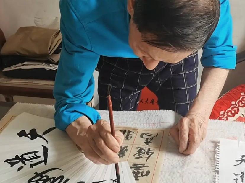闲来无事,就在自家的茶几上写毛笔字,给扇子题字。不知道他家里是不是没有高一点的写字台,这样写字对老人家来说太费腰了。