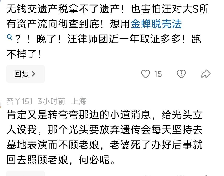 有的网友点评得特别难听,说具俊晔是没有钱交遗产税,也还不起欠银行的房贷和抵押款,他又怕汪小菲对大S生前所有财产的流向做彻查,这才想到这种表面上和气的“金蝉脱壳”之法。