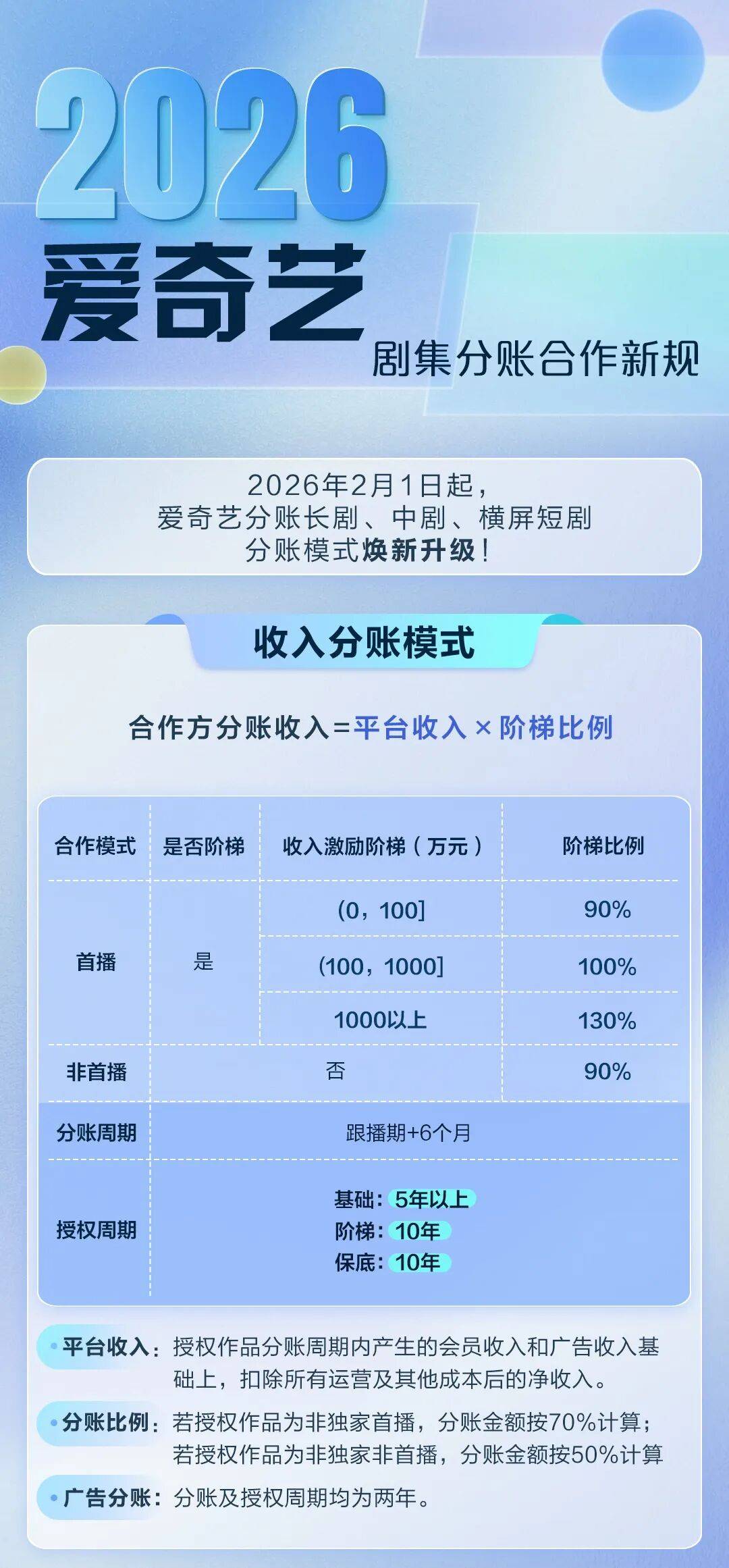 主编温静导读:在众多平台中,爱奇艺的分账规则升级尤为引人注目。不同于其他平台分业务“散点式”升级的思路,爱奇艺一次性将电影、剧集、微剧、漫剧、动漫、少儿、纪录片、知识八大业务板块的分账规则统一升级为“收入分账”模式。这套将于2月1日实施的新规,简单明了,直接让内容价值与商业回报的挂钩,将给行业生态带来深层变革。