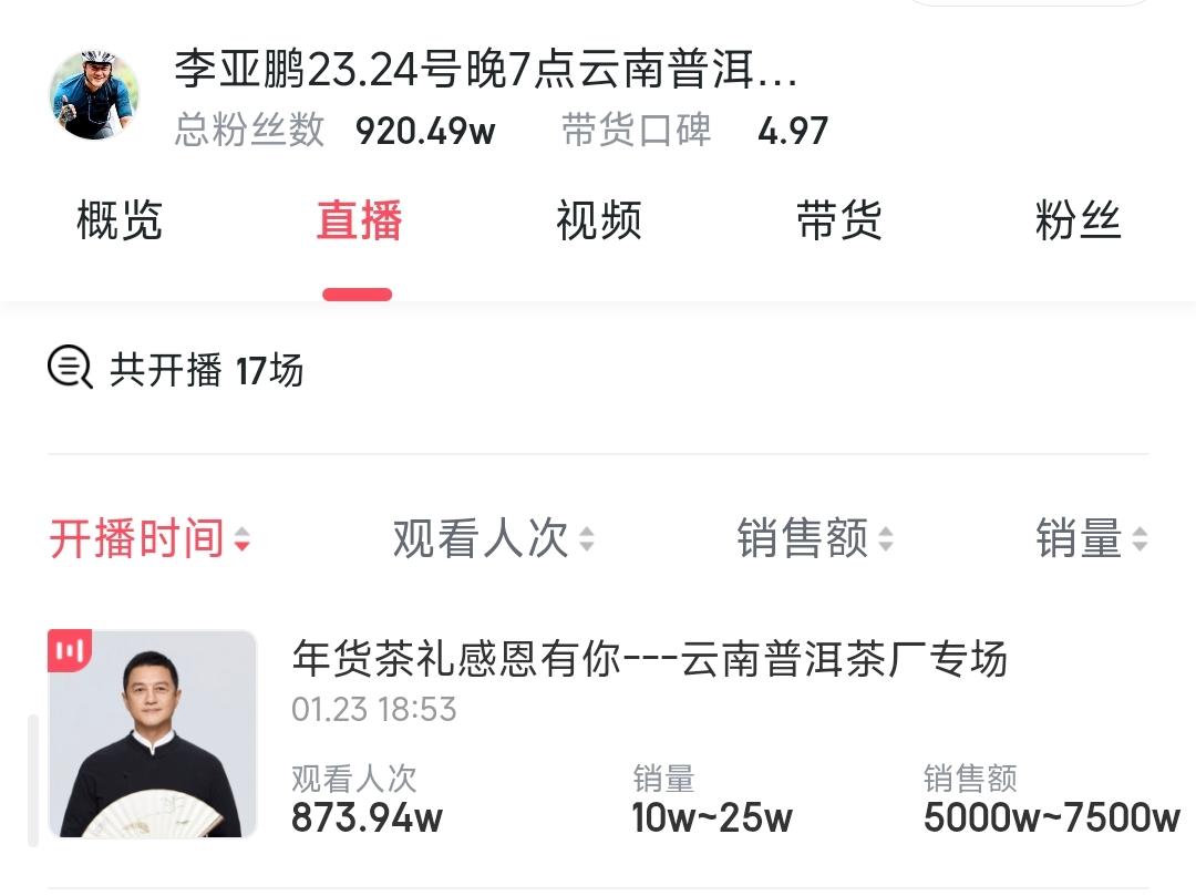 第三方数据显示,李亚鹏在抖音平台的直播间在不到一个半小时内,累计观看人数超800万,销售额突破5000万元。