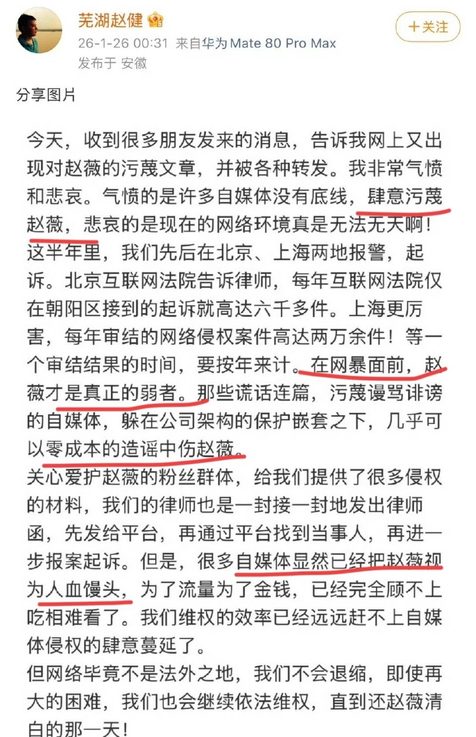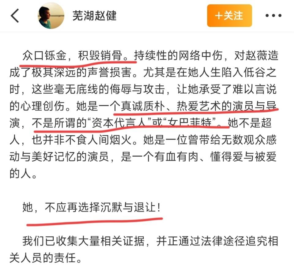 赵健痛心疾首地说,在一切网络谣言和暴力面前,自己的妹妹赵薇才是弱者。