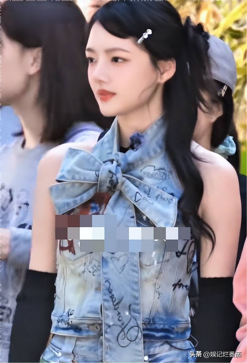 发型选择了一个半扎发,穿了一件挂脖的牛仔外套。