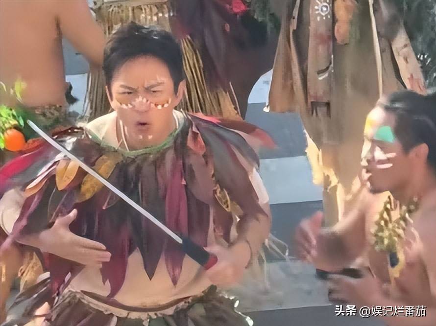 而邓超的野人造型就很普通了,肩膀上挂了一圈的叶子围脖,