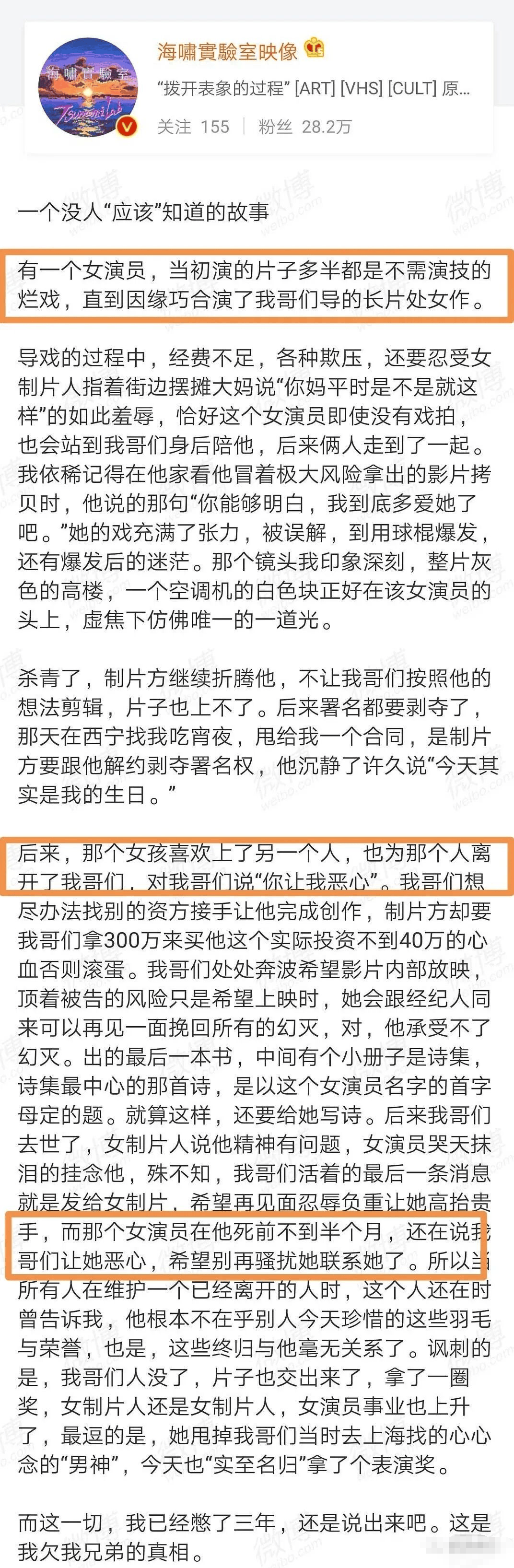 网友们朴素的正义、好友想为逝者鸣不平,这些都可以理解。但把一场悲剧的复杂成因归咎在一个人身上,把导演保护作品抑郁身亡的锅,都甩到他的前女友身上,这是不是有点太过了呢?