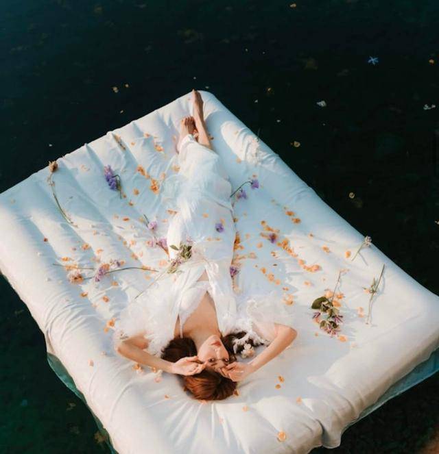 而她也躺在床上摆出了多个诱人的姿势相当性感,也十分撩人,内衣显得若隐若现,整个画面陈凯琳就躺在床上去展示自己,床也是放在水中间画面十分的唯美。
