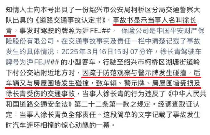 事后,交警出具的《道路交通事故认定书》显示当时的当事人(自称也是驾驶人)是徐长青(金晨的助理)