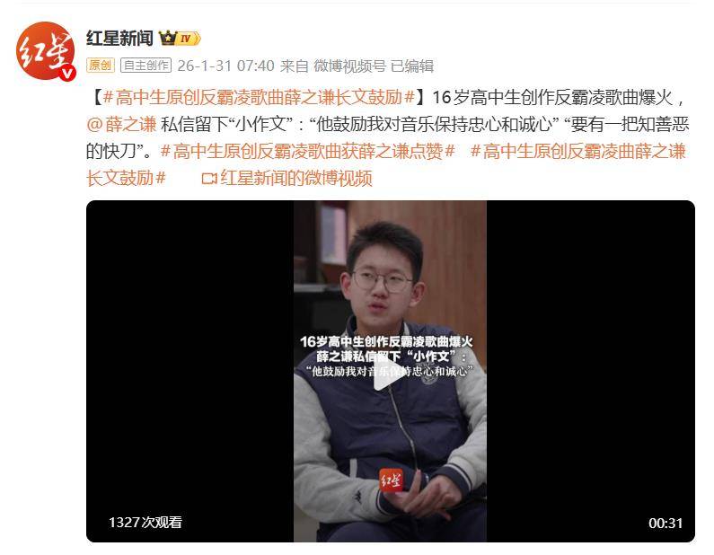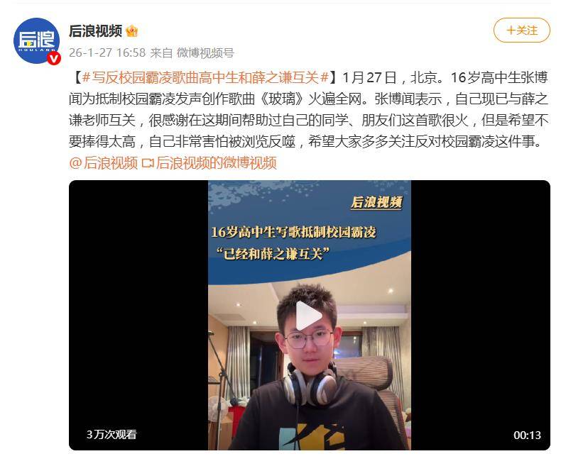 据1月31日报道,一首名为《玻璃》的反霸凌歌曲在全网炸开,创作者只是一位16岁的高中生。但让这件事从“少年才华”升级为社会议题的,却是明星薛之谦的一波“超规格”操作——他不仅主动发去千字私信“小作文”,更与这位高中生实现了微博“双向互关”。这已不再是简单的偶像鼓励粉丝,更像是一把“快刀”,精准劈开了流量时代最需要被看见的角落。