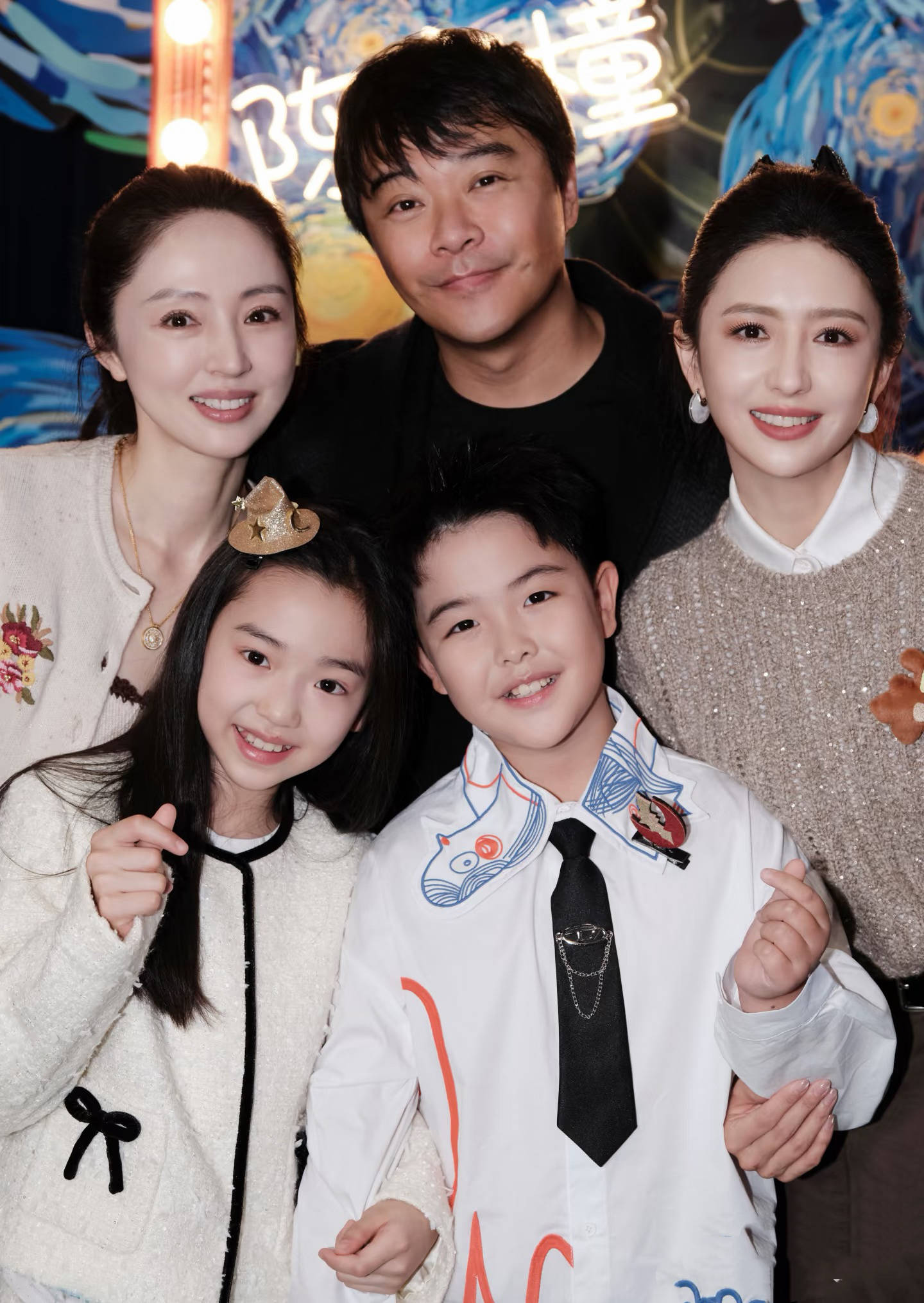 大合影里,朵朵和小酒窝在最中间的位置。朵朵伸开双手,小酒窝一手比耶、另一只手自然的放在朵朵的膝盖上。