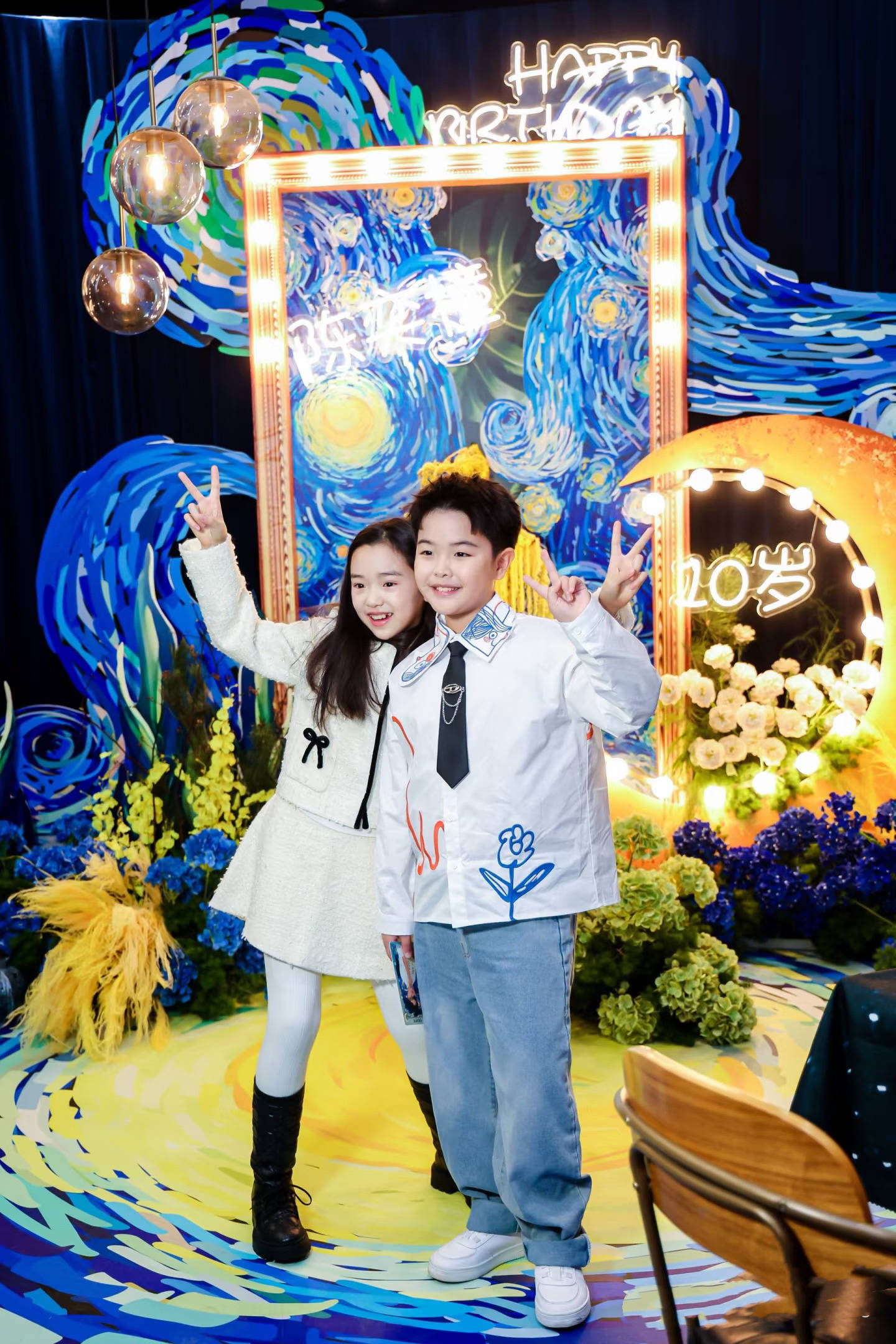作为小寿星,朵朵打扮的清爽帅气。穿了一件白色刺绣元素的衬衫,还搭配了韩式领结,时髦洋气也很酷。是那种干净、阳光的帅气,越看越像陈思诚。