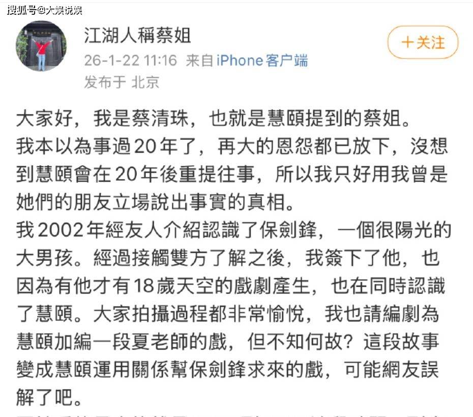 她和保剑锋是2002年认识的,之后她帮保剑锋接下了《十八岁的天空》,也因此认识了黄慧颐。从蔡清珠的字里行间,能看出作为经纪人,她特别敬业 ,也会站在艺人的角度帮忙争取利益。