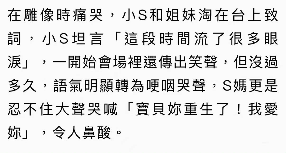小S 和范玮琪在台上致辞,小S表示这段时间流了很多眼泪,一开始会场这里传出笑声,但没过多久,语气明显转为哽咽哭声,S妈更是忍不住大声哭喊:“宝贝你重生了!我爱你!”这一刻,喷发的母爱让人鼻酸,365个日夜,不知道黄春梅是怎么挣扎着度过无数个失眠的夜晚?