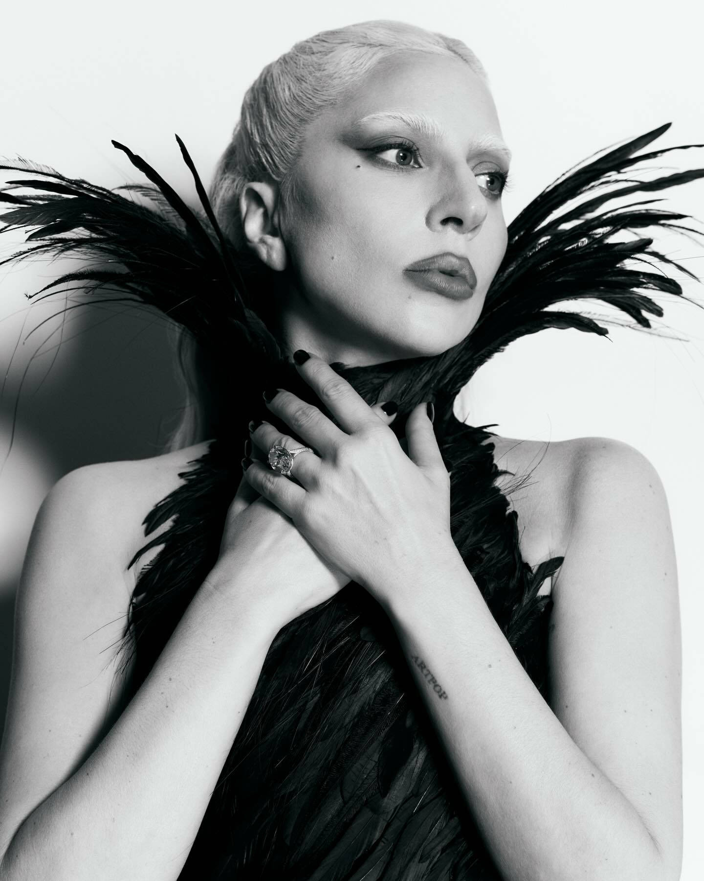 Lady Gaga抬手轻抚颈间羽毛。