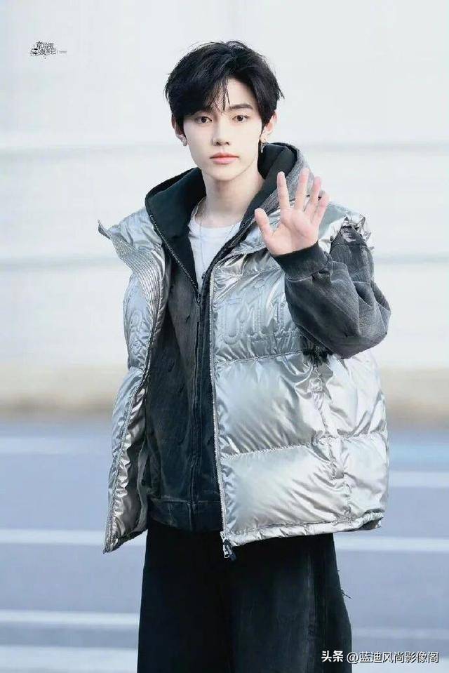 亮面银色羽绒服是这套造型的绝对核心,金属光泽的面料自带吸睛滤镜,在机场的光影下熠熠生辉,瞬间成为人群中的视觉焦点。