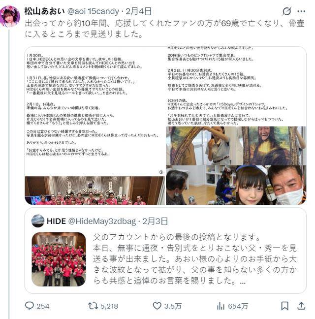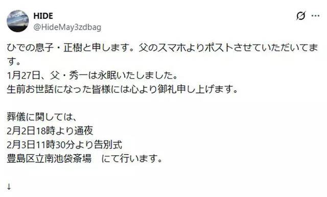 「HIDE」的儿子用父亲的账号发布了消息,简单说明父亲已经离世,并公布了守灵和告别式的时间。