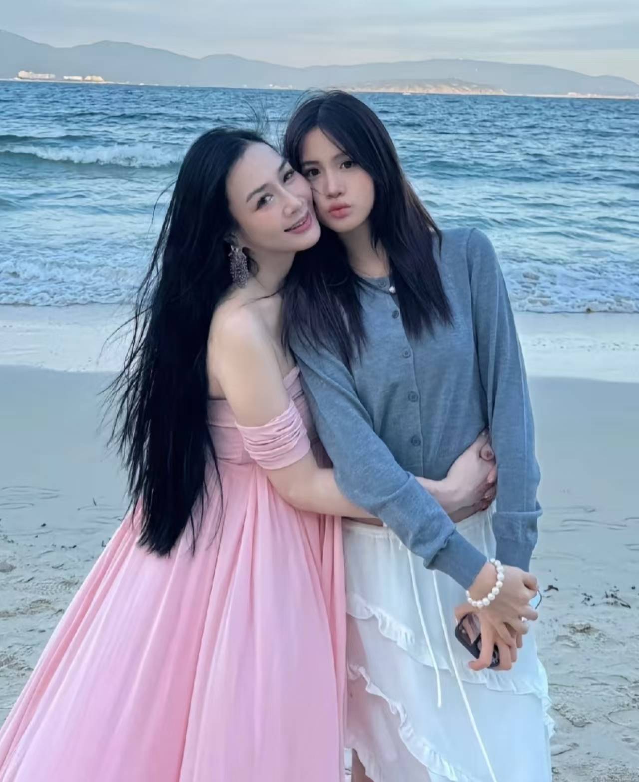 钟丽缇与Cayla海边相拥,粉裙造型温柔动人。