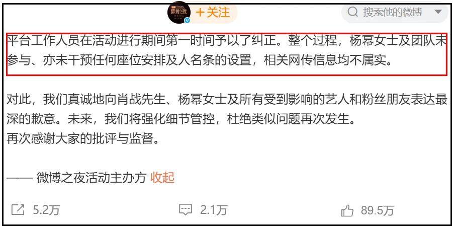 相比较之前较为模糊的致歉声明,微博之夜活动主办方最新声明清晰点出了两位明星的名字,正是肖战、杨幂,同时承认了座位争议给出席微博之夜的明星和粉丝都带来了影响。