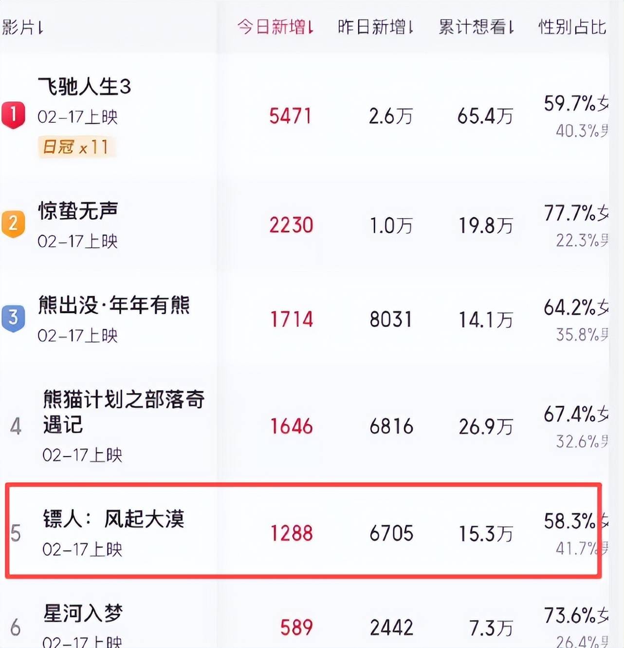 可现在它的想看人数增长却有点乏力,每天都在掉名次,已经掉到了整个春节档的倒数第二。