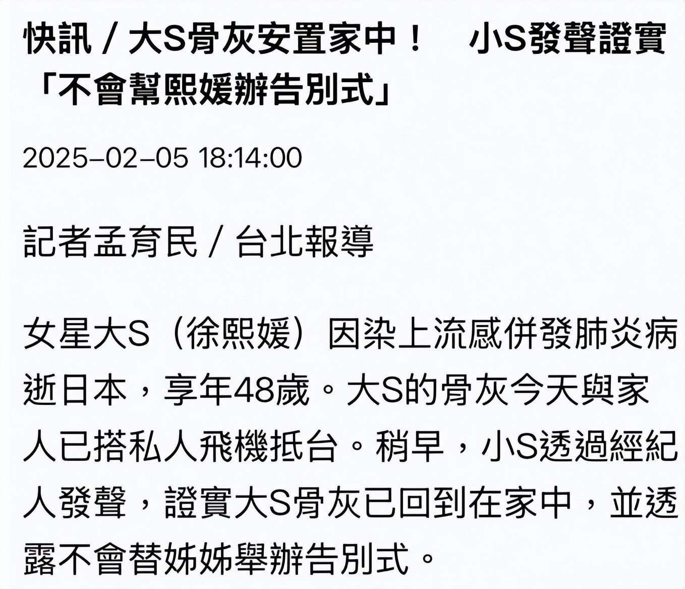 那时,她已经濒临虚脱,意识模糊,身体出现了多重危急信号,但母亲没有阻止她,妹妹也未曾询问,只是在深夜里直播跳舞,任凭她拖着几乎濒临死亡的身体,独自完成数小时的高空飞行。韩国综艺节目首次完整还原了她的返程时间线,公众才终于意识到:S家对她的照护缺位,竟体现在每一分钟的细节中。而大S始终视妹妹为她最信任的依靠,任何不适,她都会第一时间告诉她。如果那时小S能真正上心并及时介入,结局或许会截然不同。