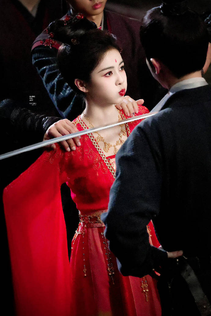 白鹿主动指导赵晴舞蹈动作,合照时自然搭肩贴脸,被观众形容为“忠犬小跟班与傲娇县主”的反差萌组合。165cm的白鹿与170cm左右的赵晴构成“飒爽女官+冷御刺客”的画面张力。