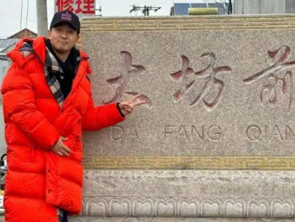 每次回家,郭晓东都习惯在“大坊村”标志前合影留念。这一习惯已持续多年,成为他与家乡的情感仪式。