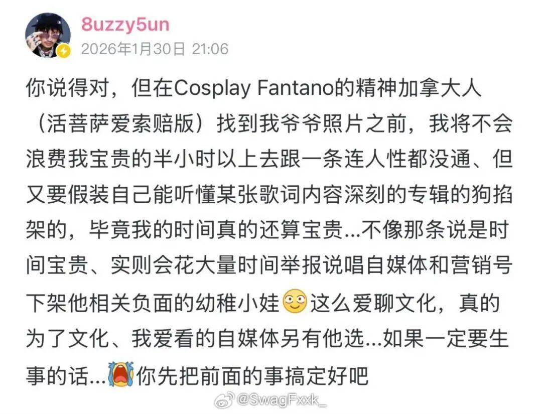“我将不会浪费我宝贵的半小时以上去跟一条连人性都没通、但又要假装自己能听懂某张歌词内容深刻的专辑的狗掐架的,我爱看的自媒体另有他选。