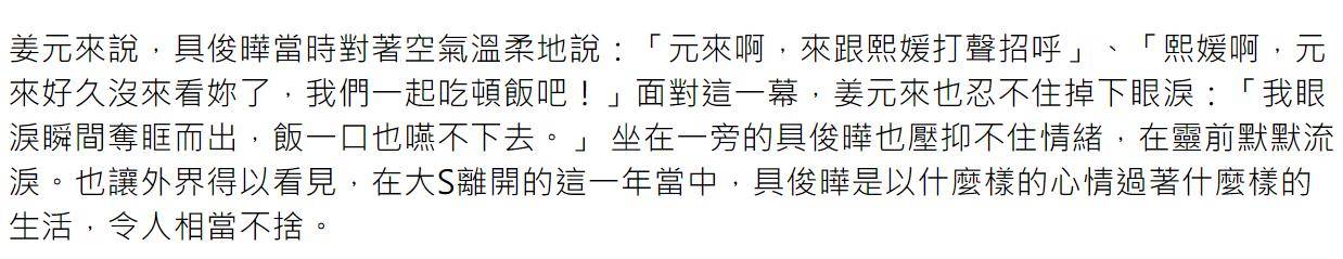 而具俊晔在向媒体说起大S时,一直不用大S的名字,而是用“那位”,“那个人”替代,特别不尊重人。