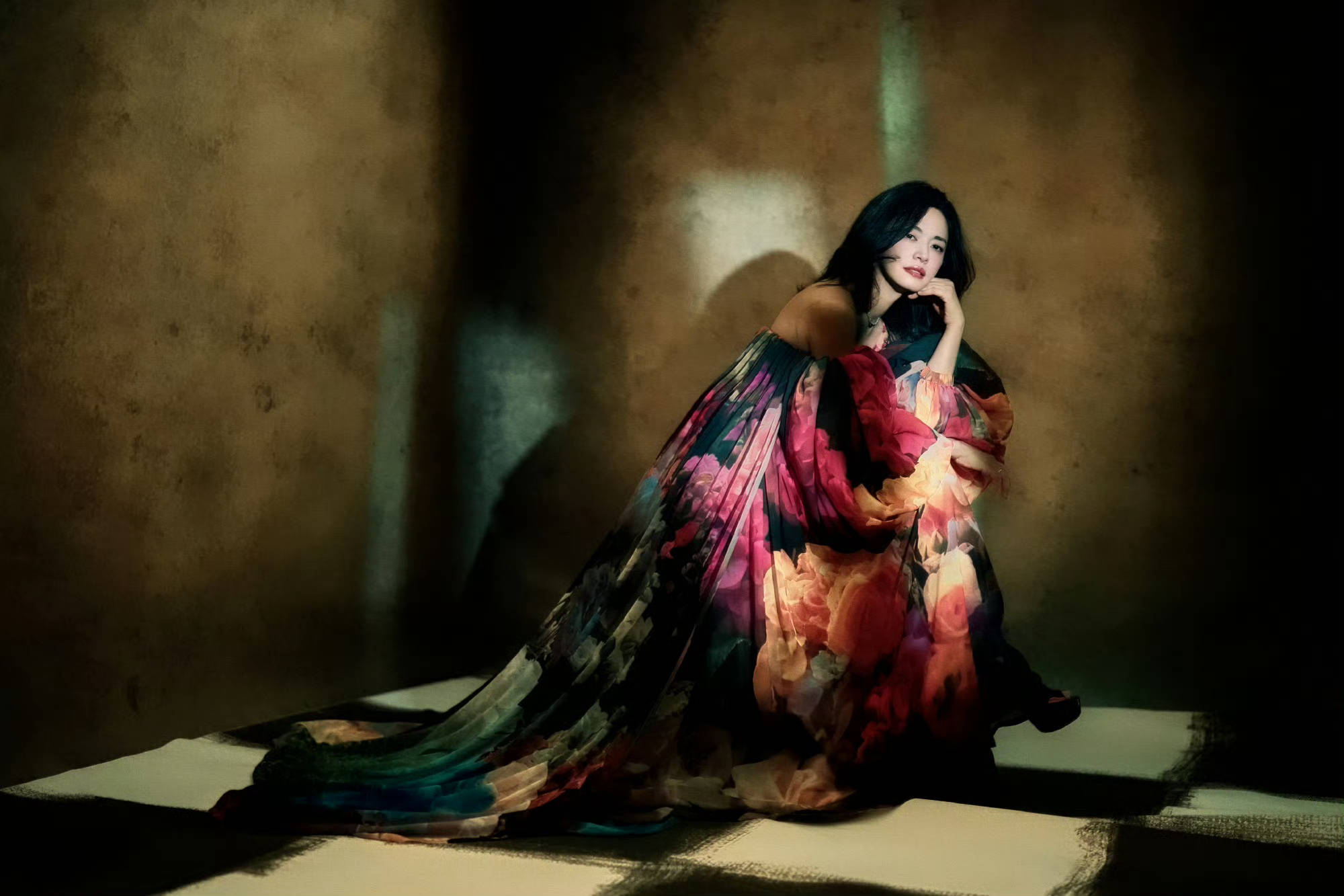 姚晨繁花礼裙铺开在地,慵懒又妩媚。