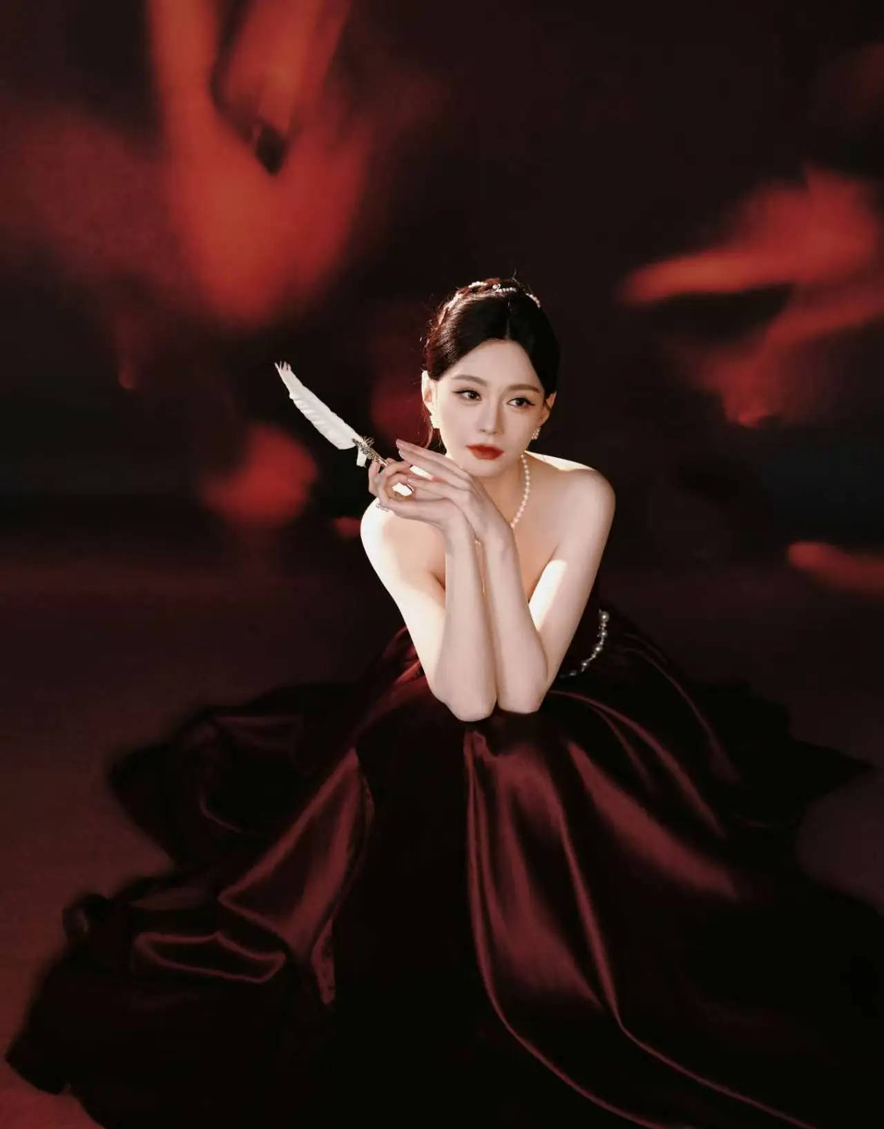 沈梦辰手持白羽笔,优雅迷人。