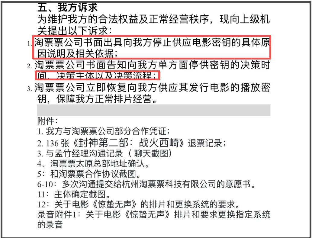 针对相关情况,该影院表示与发行方负责人多次协商无果,所以向上级机关举报并提出诉求,希望淘票票书面出具相关断供密钥的依据及说明,以及书面告知断供的决策主体和流程,并恢复密钥供给。为了佐证言论属实,该院线提供了相应的合作证据和《惊蛰无声》排片协商的截图、录音附件。