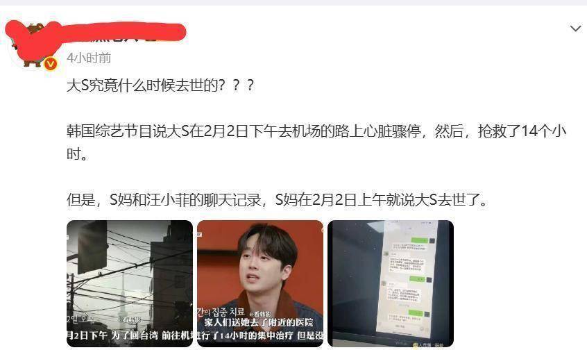 博主贴出的关键信息很明确:韩国KBS电视台的王牌综艺《名人生老病死的秘密》在专题特辑里爆料,大S是2月2日下午在前往机场的途中突发心脏骤停,之后经过了长达14小时的抢救,最终还是没能留住生命。