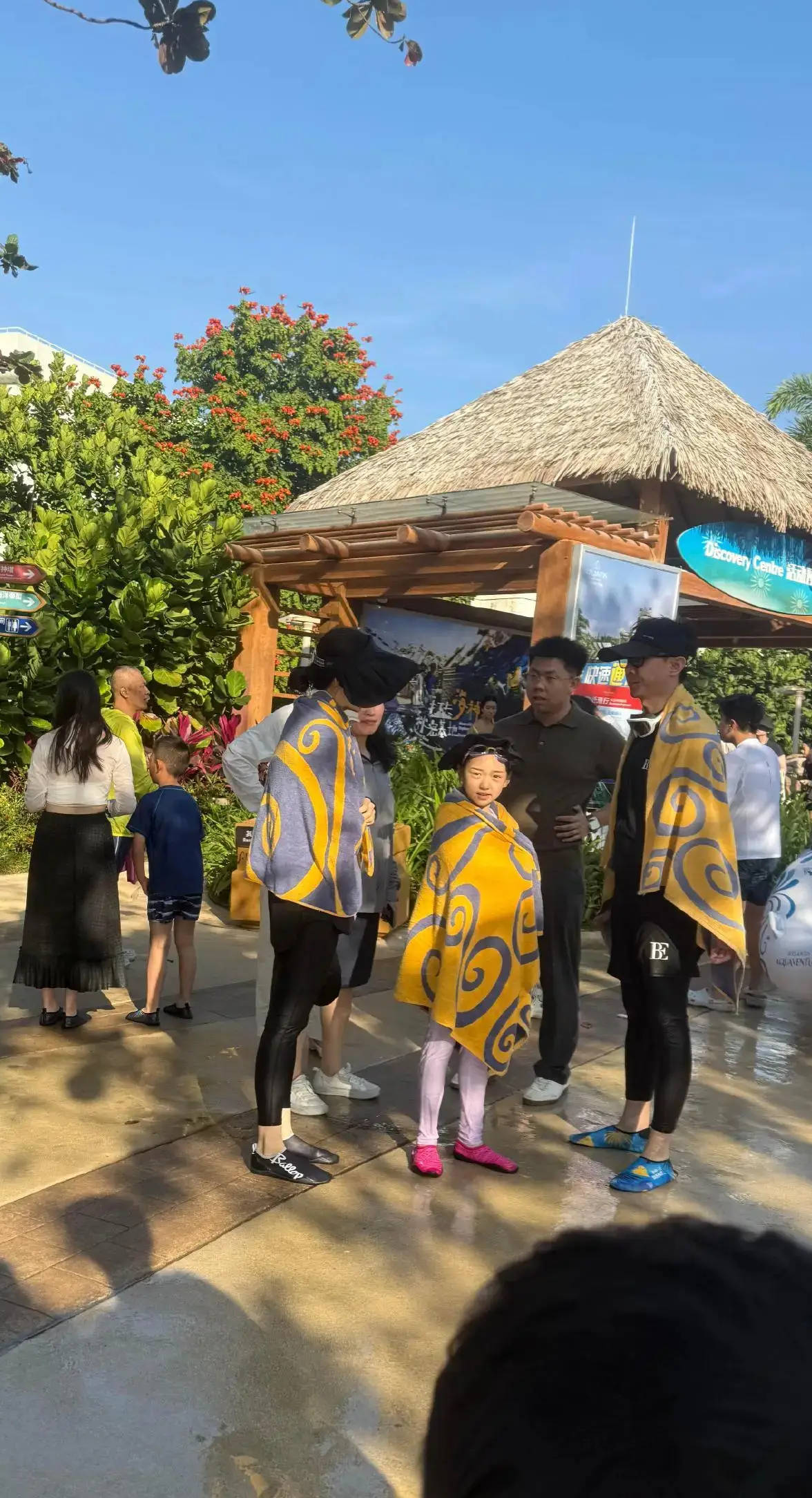 董璇与小酒窝、张维伊刚玩完水,都披着毯子保暖。