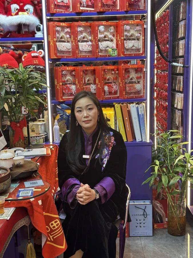 前不久,义乌国际商贸城组织市场里的老板娘拍拜年视频。聂自勤换上了她最喜欢的那件新中式刺绣外套,好生捯饬了一番。