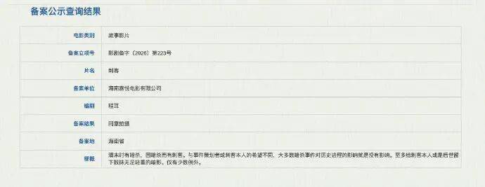 据国家电影局最新备案公示,《刺客》立项,编剧为程耳。剧情梗概:清末时有暗杀,因暗杀而有刺客。与事件策划者或刺客本人的希望不同,大多数暗杀事件对历史进程的影响就是没有影响。至多给刺客本人或是后世留下数抹无足轻重的暗影。仅有少数例外。
