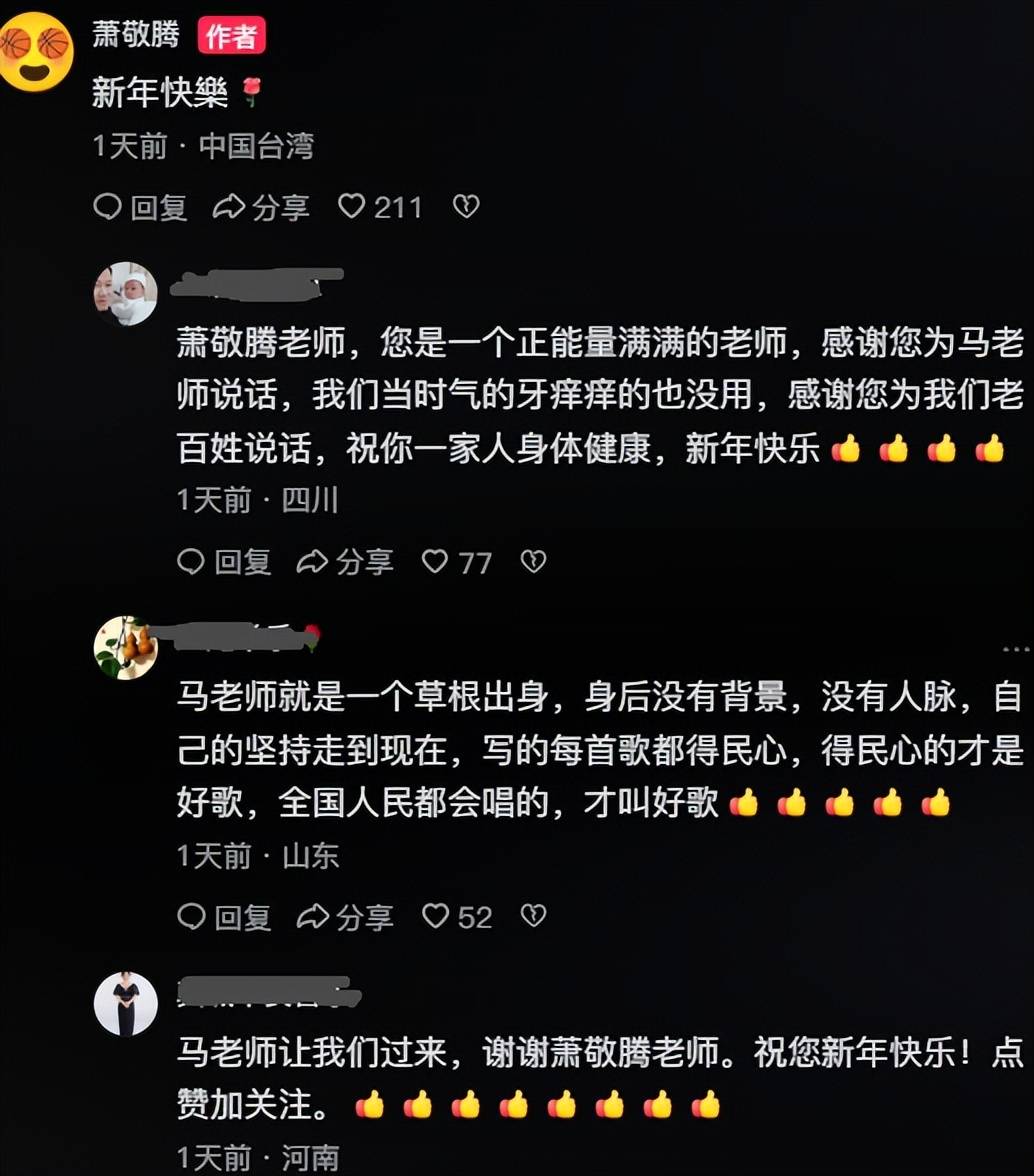 节目播出后,马健涛粉丝涌入萧敬腾的抖音账号留言感谢他的仗义执言,还有粉丝直接自报家门:是马老师让我们过来的。